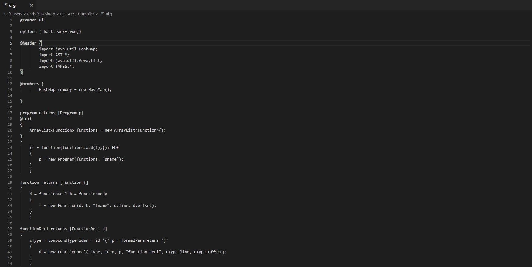 For my compiler class I wrote a compiler for the unnamed languages. This project really helped cement OOP best practices and pattern-based development. This projects heavily relies on the visitor and factory patterns. My compiler defines the grammar of the language, handles type-checking, converts to an intermediate representation and generates .j files. This project was written in java and used the lexer/parser ANTLR for the grammar.
